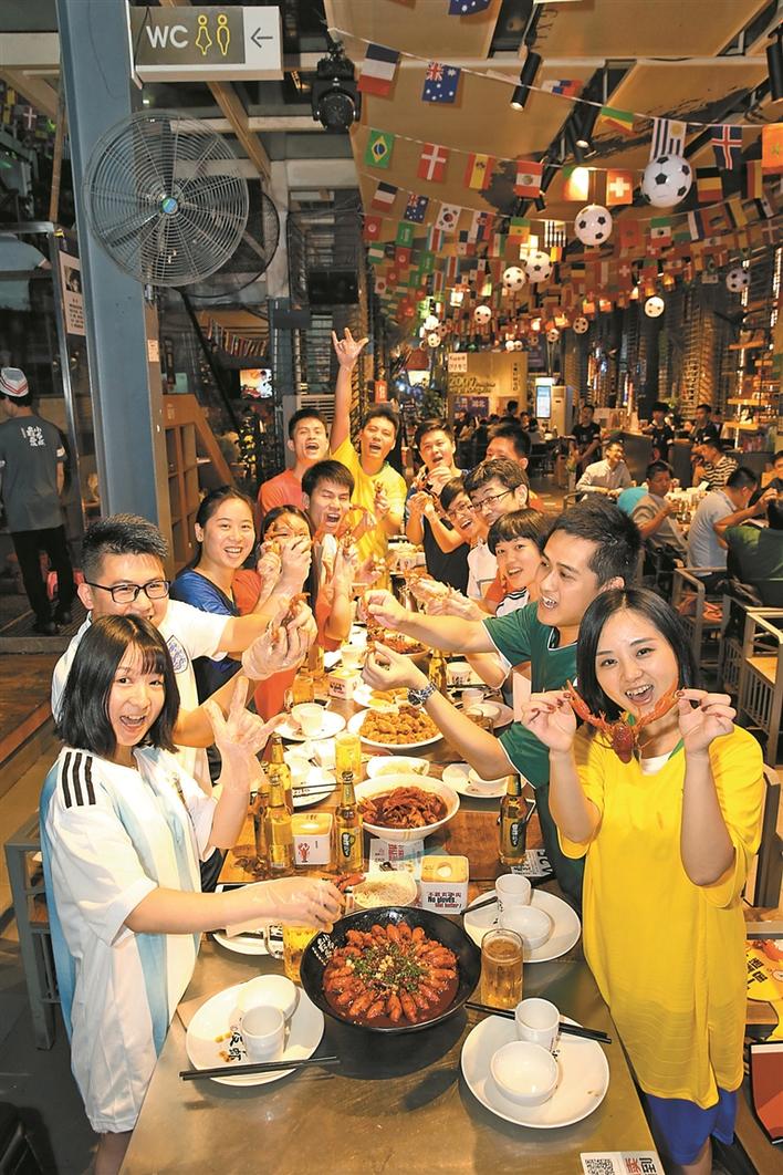 但这次世界杯期间,许女士找到了一个好去处:“看球其实不重要,重要的是大家聚在一起,但口味一定要找大家都能接受的,所以挑来挑去最后选择了龙巢。”在昨晚的龙巢店内,一整盘的蛋黄味小龙虾被许女士吃个精光:“这是吃得最畅快的一次,整个氛围也很到位,接下来的比赛就扎根在这里了。”