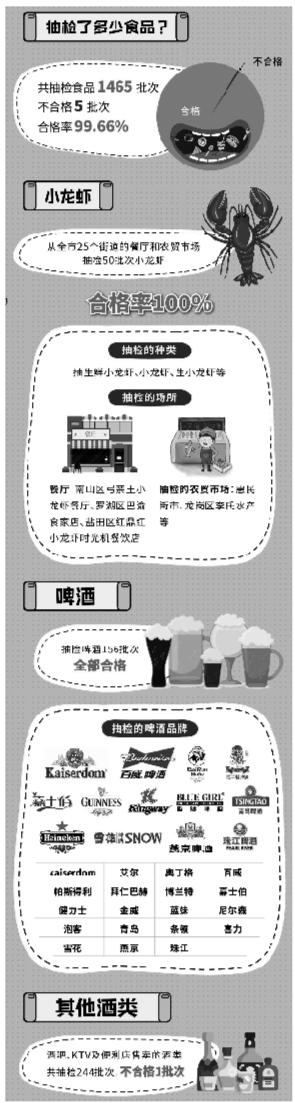 据了解,在世界杯足球赛开赛前夕,深圳市食药监局就通过网络调查活动对市民票选出的热门宵夜食品进行了抽检,包括烧烤类食品、啤酒、小龙虾、零食炒货坚果制品、膨化食品、酱卤肉制品,同时对备受球迷欢迎的酒吧等场所售卖的酒类产品进行抽检。行动共抽检样品1465批次,发现不合格样品5批次,合格率达99.66%。