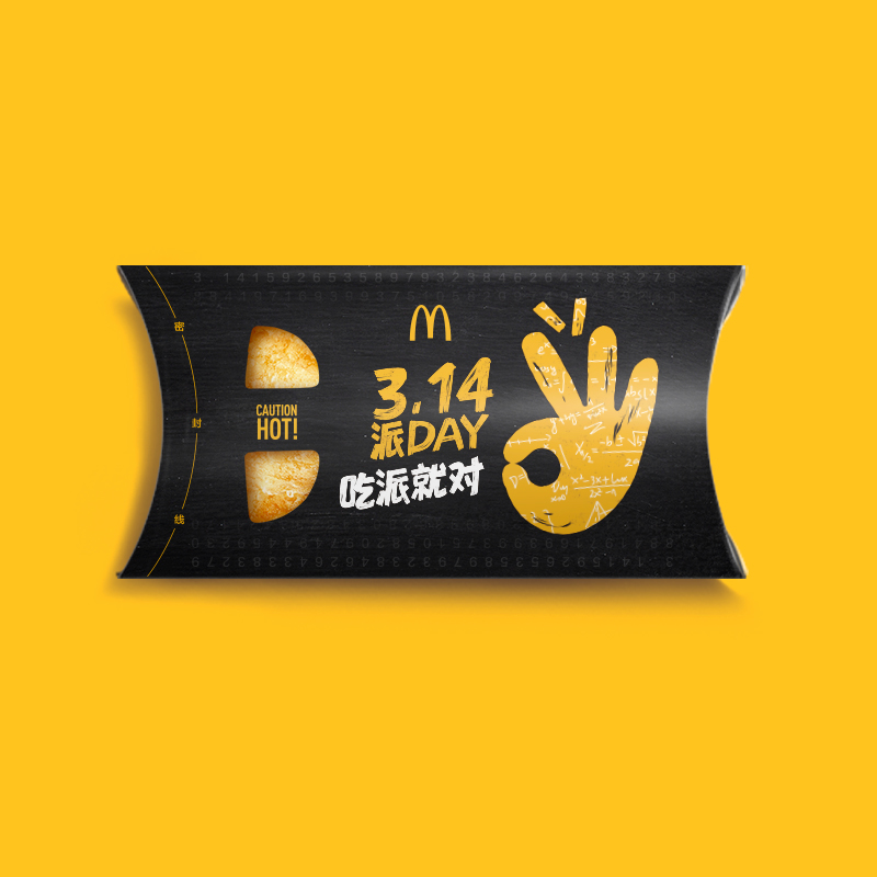 “派”与“π”谐音,麦当劳将每年3月14日的国际圆周率日设为“派DAY”,邀请粉丝一起来餐厅吃派庆祝。