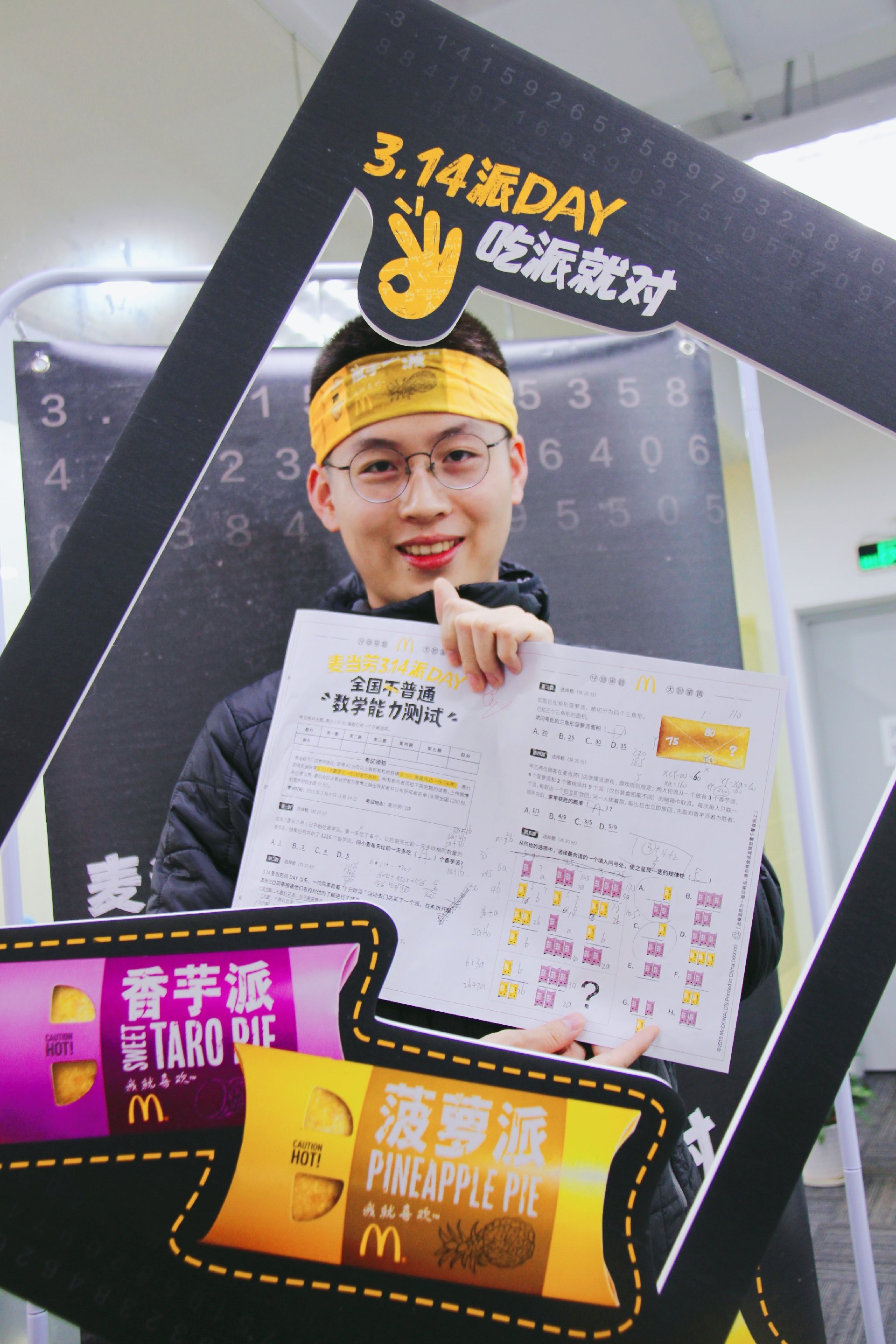 此外,麦当劳中国在“派DAY”期间推出“派DAY全国不普通数学能力测试”,和消费者一起欢庆“派DAY”,享受数学的乐趣。顾客在餐厅购派即可获得限量“数学能力测试”考卷一张,也可以扫描“派DAY”特别版包装上的二维码,进入“派DAY全国不普通数学能力测试”线上版,通过测试的消费者有机会获得派DAY限量周边。