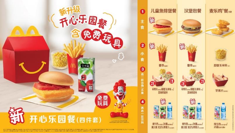 在确保产品美味与质量的前提下,麦当劳一直致力于实现更少盐、更好油、更多蔬果谷物。新开心乐园餐参考了“麦当劳全球儿童营养标准”,并充分考虑了中国儿童的膳食营养需求。新套餐从三件套升级为四件套,包括一份主食 (可选肉类蛋白来源:鱼、牛、鸡)、一份小食 (可选迷你薯条、玉米杯)、一份蔬果 (可选苹果片、鲜蔬杯、玉米杯)和一份饮品 (可选纯牛奶、水、100%苹果汁 )。