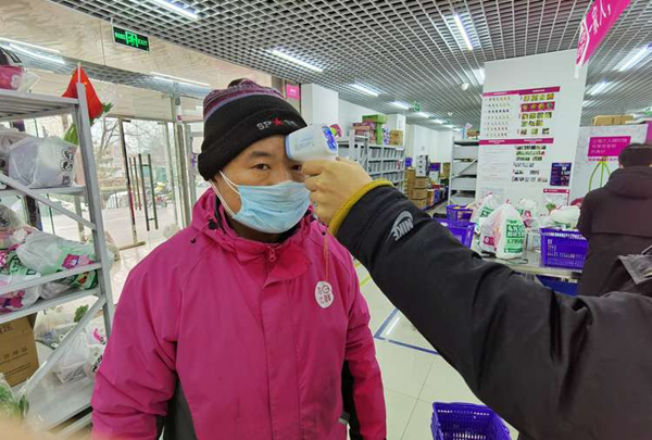 每日优鲜工作人员为配送员测量体温
