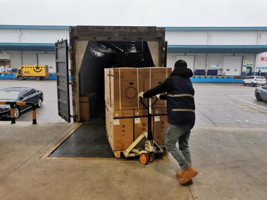 仓库员工将如新中国捐赠的400台空气净化器出库