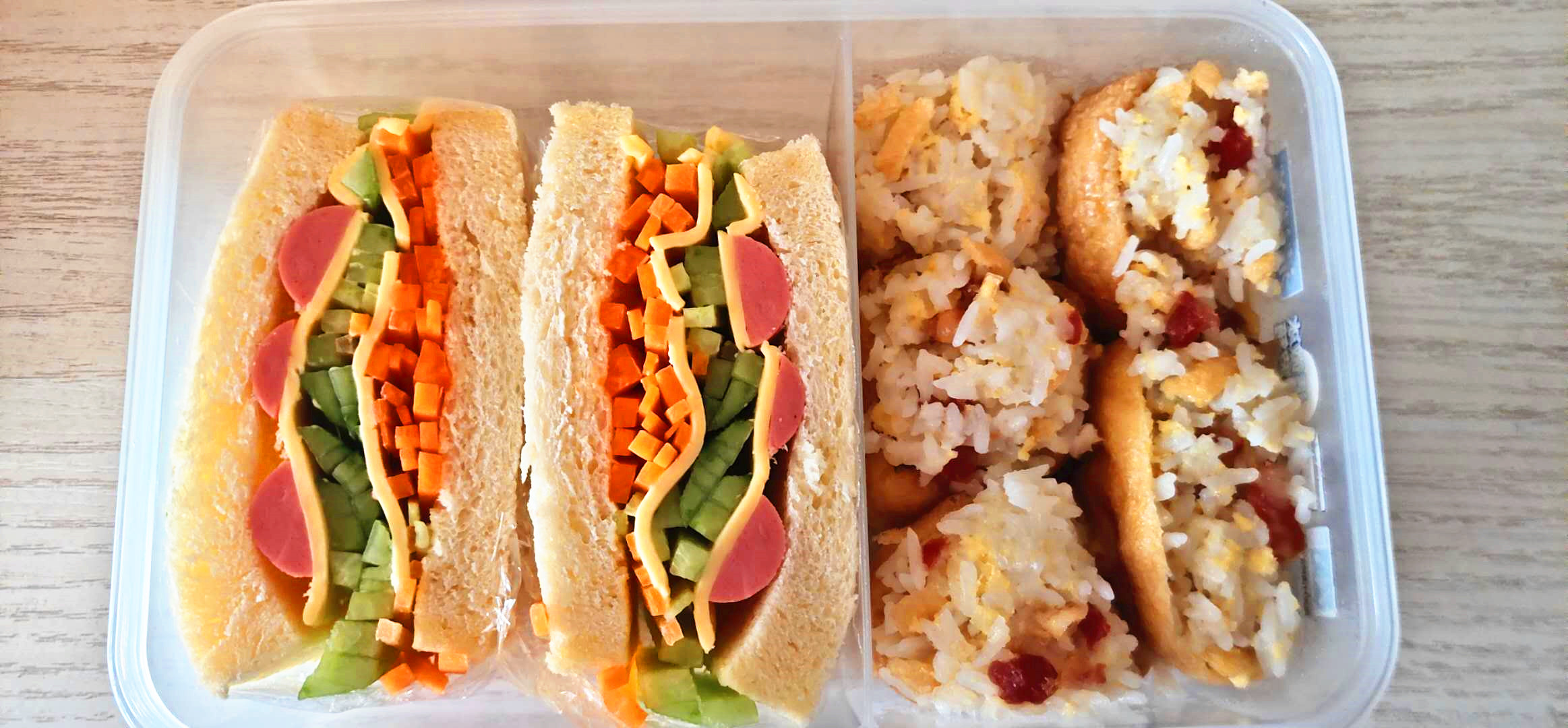 胡萝卜和青瓜切丝,腊肠切成粒火腿肠对半切,准备面包四片,芝士片四片。拿一张保鲜膜,将一片面包片放在上面,然后依次摆上胡萝卜、芝士片、青瓜片和火腿肠片,再放上一片面包片,用保鲜膜包起来。包紧,然后从中间切成两半,装在饭盒里即可。将腊肠粒放在剩饭里,加盐和酱油一起拌均后,再放进掏空的豆腐泡里。整个豆腐泡隔水蒸大约十分钟左右,再装在饭盒就可以了。