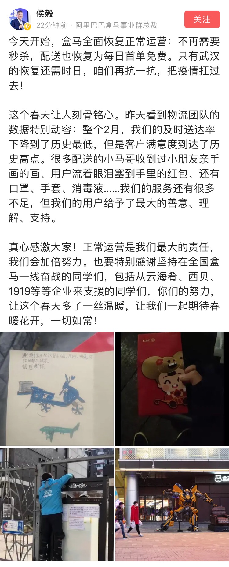 盒马总裁侯毅在其社交平台账号上表示,盒马全面恢复正常运营了,用户也可以告别秒杀了,“疫情期间,正常运营是我们最大的责任,我们会加倍努力。武汉的恢复还需要一些时间,大家一起再抗一抗,把疫情扛过去。”