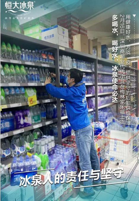 抗击疫情不停止,恒大冰泉除了捐赠物资提供爱心水,为了确保当地饮用水的足额供应,一批批恒大冰泉也在各大商场大量上架。
