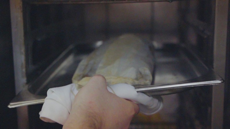 清蒸鲈鱼是常见的粤式吃法,本期,四季酒店主厨毕柏克为吃货们带来别样的鲈鱼吃法——“烤纸包鲈鱼”。他将鱼进行腌制后,用烘焙用纸裹紧,在烤炉中烤制40分钟。吸收了海鲜文蛤、白葡萄酒精华的鱼肉紧实鲜嫩,在打开外包纸的那一刻,香气四溢,让人欲罢不能。如此烹法,也能最大限度保存鱼的营养和鲜美。