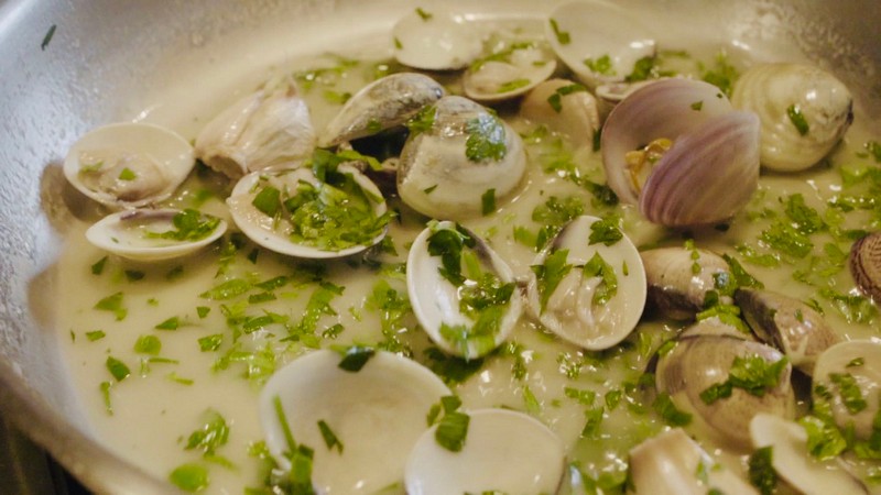 6、在平底锅中加入适量橄榄油,一边翻炒大蒜瓣和文蛤,一边加入白葡萄酒。待文蛤开壳后,加入柠檬汁以及欧芹,继续烹煮。待熟后,捞起备用;