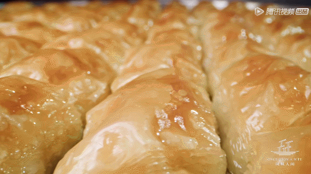 这还没到核心。巴克拉瓦最关键的步骤是熬糖,只有资历最老的师傅才能掌握,温度、酸度、水、时间让糖液达到平衡,于是,我们看到完美的最后一步: