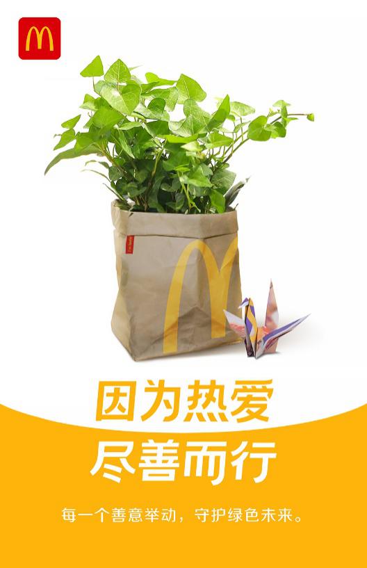 在业务快速发展的同时,麦当劳对身处的社区和环境同样心怀赤忱,努力打造绿色餐厅、持续优化绿色包装,充分利用自身的规模,用一系列绿色行动助力可持续发展。麦当劳中国承诺,到2022年开设超过1,800家“绿色餐厅”,符合美国绿色建筑委员会颁发的LEED认证标准;2020年,麦当劳中国所有的纸制包装,都将100%来自经森林管理委员会FSC(Forest Stewardship Council)认证的原纸。