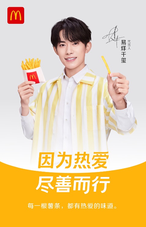作为千禧一代的杰出代表,易烊千玺自小坚守对艺术的热爱,以百炼成钢的执着对待每一段旋律、每一个舞步、每一句台词,只为在每一束聚光灯下绽放无瑕光芒。他热爱挑战,不断拓展自身发展的边界,作为优秀的演员、歌手和舞者,一次次呈现惊喜。同时,他身体力行做公益,用行动诠释榜样力量,是充满正能量的青年偶像。易烊千玺的成长经历与个人发展和麦当劳“因为热爱,尽善而行”的品牌理念不谋而合,也因此促成了这次惺惺相惜的合作。