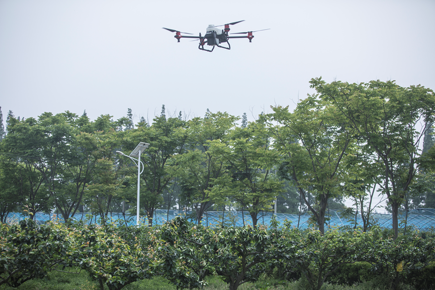 (上海首个盒马村,翠冠梨数字农业基地,无人机正在低空施药)
