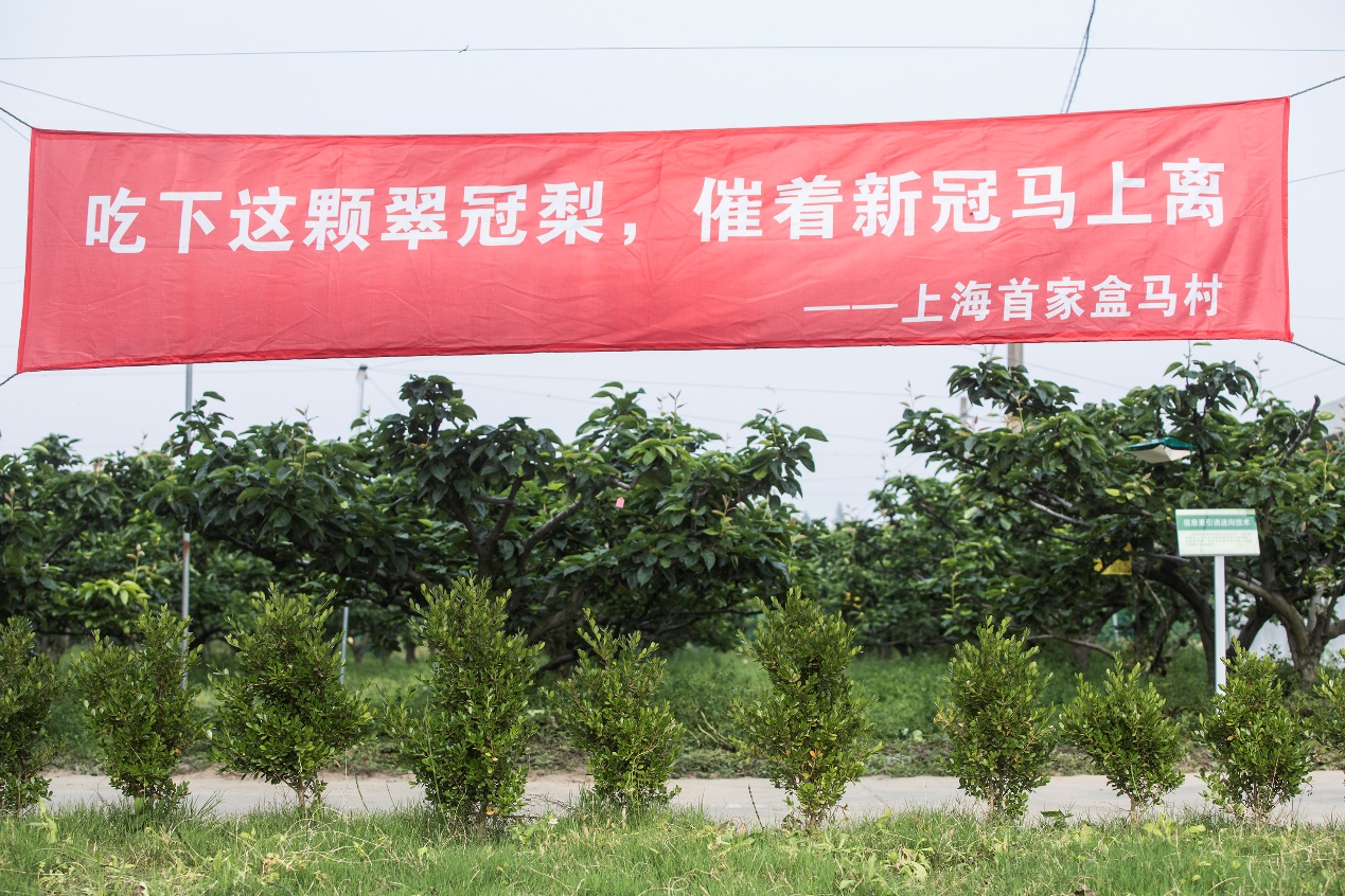这家盒马村位于崇明岛西北角,绿华镇华西村。最近,华西村很多农民都有了一个新想法:他们想把种植的翠冠梨改名,叫催冠离——让新型冠状病毒赶紧离开。“它不只是一种水果,更代表一种希望。”