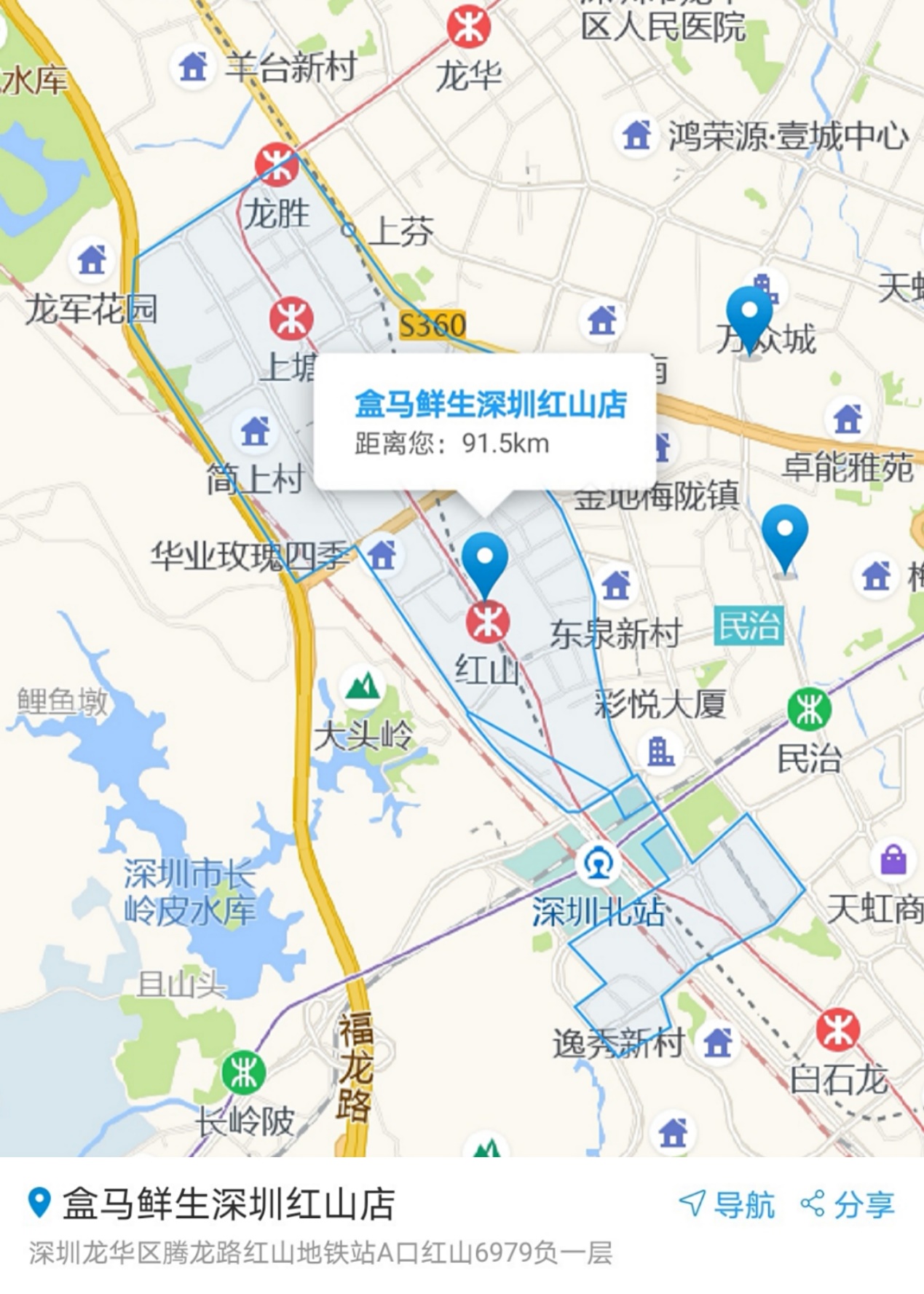 盒马红山店的“盒区房”覆盖广深港高铁沿线,北至龙华区和平路,南至民丰路,横跨三个地铁站,而深圳最大的高铁站深圳北站(外广场)也在盒区范围内。大数据中心监测,深圳北站商圈内居住人口达到了30.8万人,工作日客流约75.77万人。