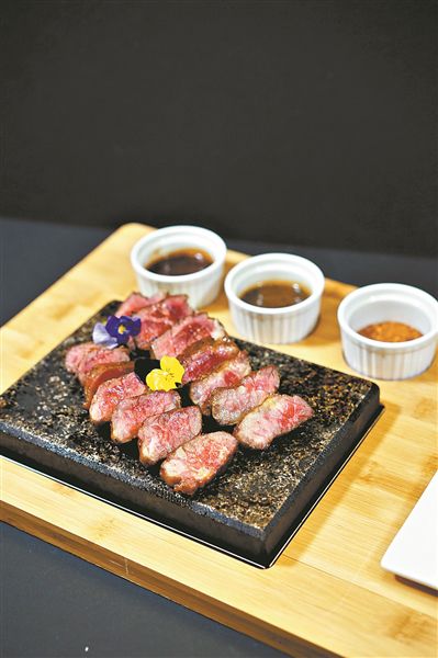 4.准备一块烧热的石板,将牛肉厚片放于其上,配上黑椒汁、黑松露汁和牛排调料即可(图⑥)。