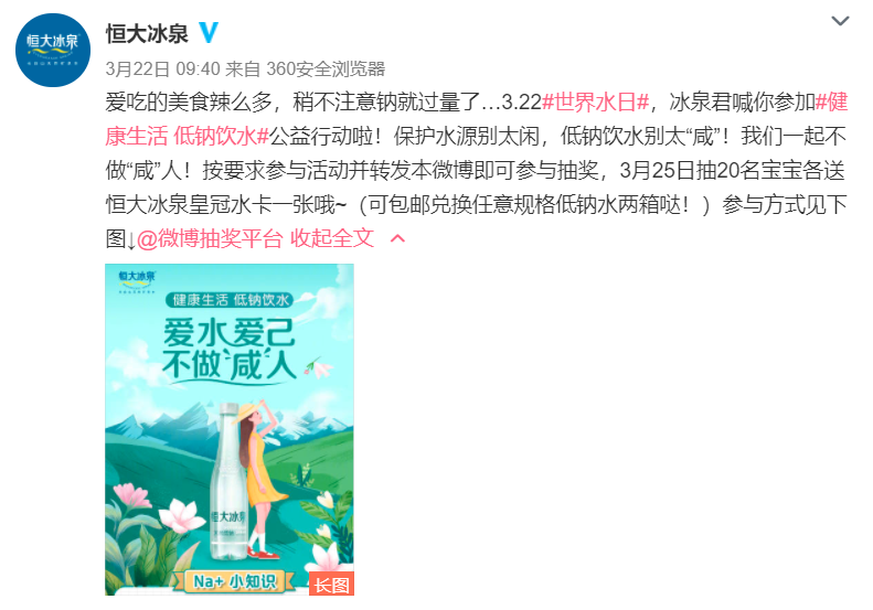见圳客户端·深圳新闻网2021年3月30日讯 (记者 常军平)目前正值3月22日第二十九届“世界水日”以及3月22—28日第三十四届“中国水周”之际,恒大冰泉天然低钠矿泉水深入洞察借势,发起以不做“咸”人为主题的公益活动,引发了全网的关注热议和积极参与,刷屏社交媒体,成为新的公益“爆款”。