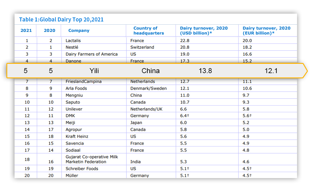 伊利蝉联全球乳业五强、连续8年稳居亚洲乳业第一