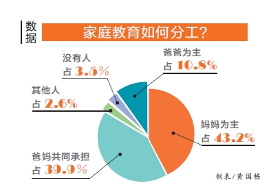 此次调查中,用14个指标考察家庭教育分工情况,包括:辅导孩子学习、培养孩子特长、接送孩子上下学、开家长会、培养孩子日常行为习惯、纠正孩子的不良行为、教孩子明辨是非、照顾孩子的饮食起居、和孩子一起游戏及和孩子聊天。统计数据显示,家庭教育分工中,“妈妈为主”的家庭占43.2%,“爸爸为主”占10.8%,“爸妈共同承担”占39.9%,“其他人做”占2.6%,“没有人做”占3.5%。