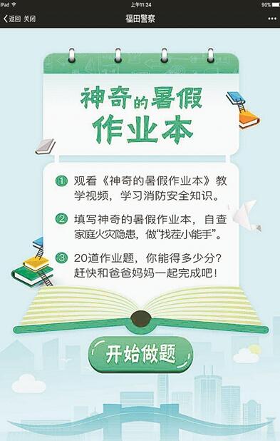 对于本学期这份特别的暑假消防作业,上沙中学安全主任刘伟告诉记者,相比过去纸质版消防安全宣传册更为形象和生动,能激发学生的学习兴趣,里面的消防知识也更容易被学生所接受。“消防安全宣传就该这样,过去灌输式的宣讲,孩子不爱听,老师讲的也枯燥,这样的形式把大家的积极性调动起来了,孩子们有了兴趣才能在现实生活中学以致用。”刘伟说,“我们特别重视安全教育,安全教育已经成为我们学校学生的必修课。”据刘伟介绍,除了会给学生留一份假期家庭消防作业外,在每个学期的散学典礼上,学校法制副校长都会来到学校,给学生上一堂生动的法制安全教育课,通过丰富的案例,带给学生假期内消防、交通、人身等多方面的安全知识。同样地,等假期结束,学生回到学校,也会安排安全教育作为开学的第一节课。