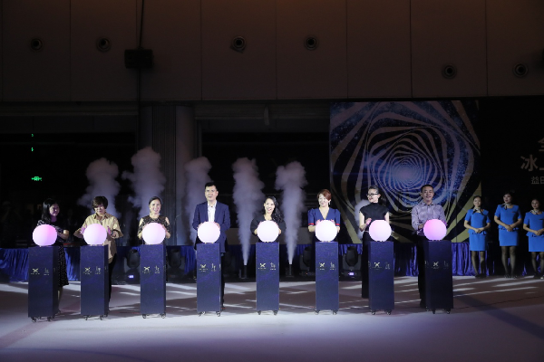 在倒数声中,益田旅游商业集团副总裁孔德政、副总裁王蕊、益田假日广场总经理刘玲与全明星滑冰俱乐部总裁王睿,gaga鲜语创始人冯敏, DISSONA全国营运总经理王立颖及VIP代表,共同按下激光装置,10000只气球组成的蓝色鲸鱼散落冰面,瞬间晕染为一片蓝色海洋,也正式宣告“益田假日广场十周年”系列活动的开启。