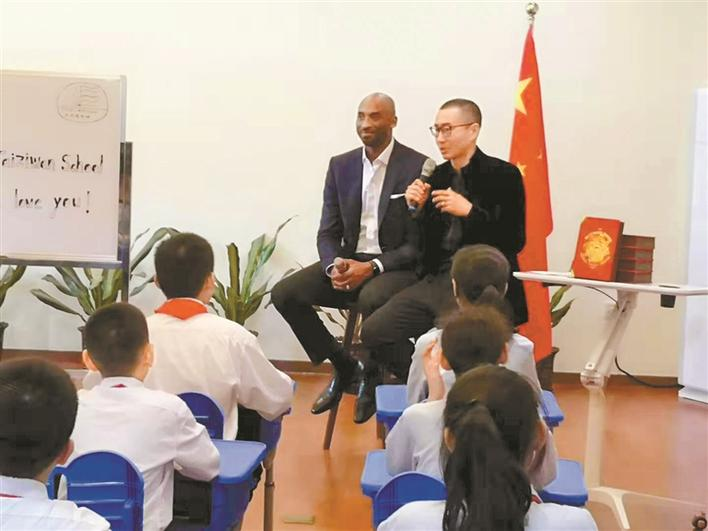 晶报3月18日讯 3月17日上午,参加完篮球世界杯抽签后的科比如约来到深圳蛇口太子湾学校,给学生们上了一节课,同时还开了一个新书见面会。