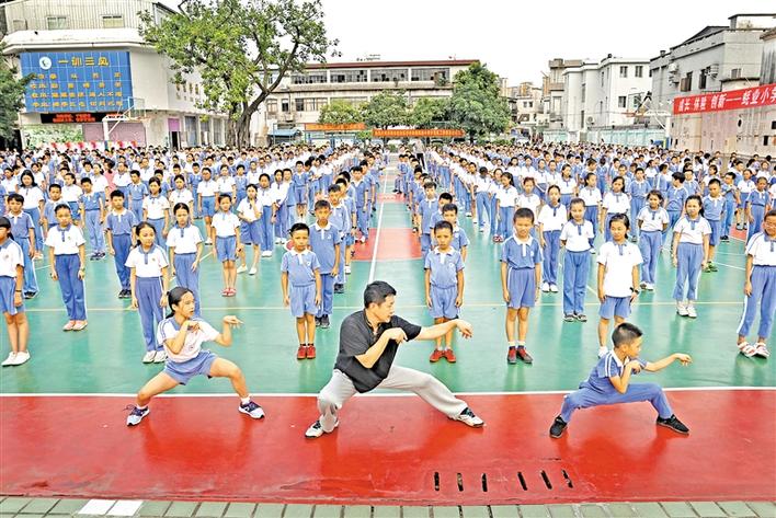 当天,利用课间阳光体育的时间,蚝业小学1000余名学生在校内饶有兴趣地接受了华林派武术操的教学,华林螳螂拳代表性传承人冼润长师傅详细地讲解了武术操,并实地示范。华林派武术操是“华林螳螂拳”代表性传承人冼润长针对青少年所创编,融入了螳螂拳的武术元素,深受学生的欢迎。活动不仅让孩子深入了解优秀传统文化,还让孩子“武”起来,益于舒缓学习压力。