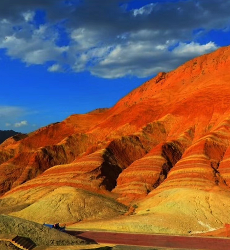 夜宿张掖丹霞公园,早晚之景,分外别致,既有朝阳晚霞的映衬,也有山貌土质的特性,构筑成一幅幅天地合一的壮丽画面,于是,我又写下来“猜2”——-丹阳裸照山土红,晚霞斜映沟丘重,七色带环竞争艳,彩云作被情更浓!此又何处?