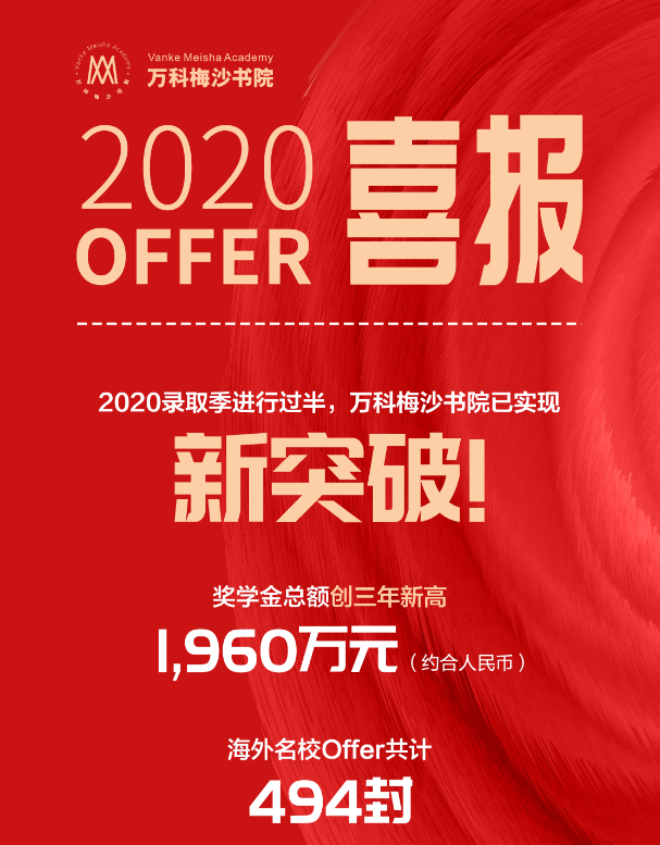 2020申请季还未结束,梅沙学子已收获494封海外名校录取Offer,奖学金累计约合人民币1,960万元,创三年新高。其中,来自美国Top100综合性大学及文理学院的录取通知书有356份,来自美国Top50综合性大学及文理学院的录取通知书有180份。