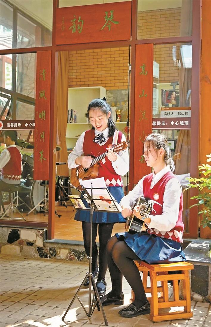 校园一角的“乐·舞台”上摆放着一架钢琴,陈铁成校长说:“在没有疫情的时候,这架钢琴是不上锁的,任何老师或学生都可以弹奏。同样开放的还有琴韵阁、清心阁,不要担心学生会破坏这些东西,美自然地呈现在学生们面前,自然地发生,真正的教育就是在这样的情境中发生的。”