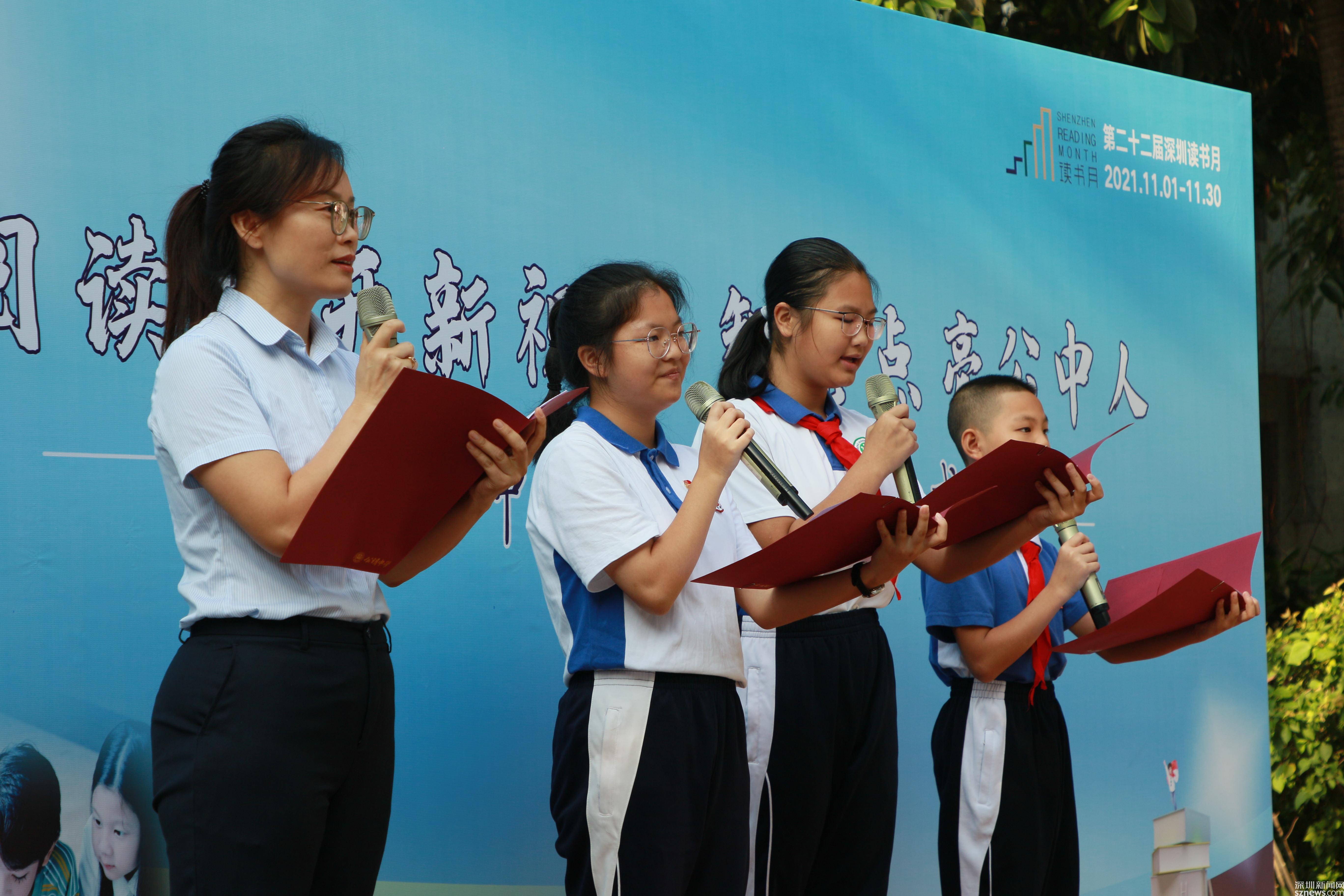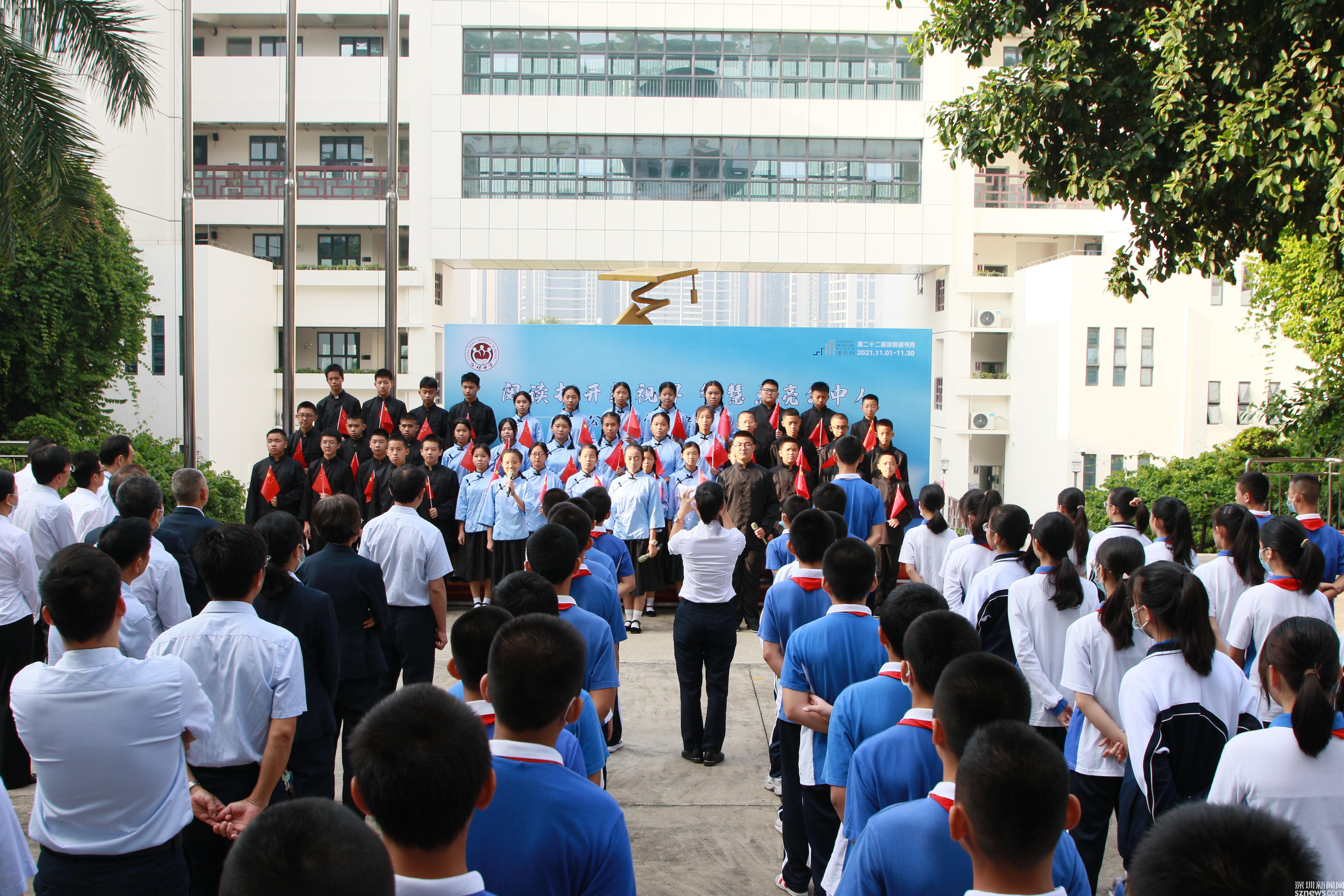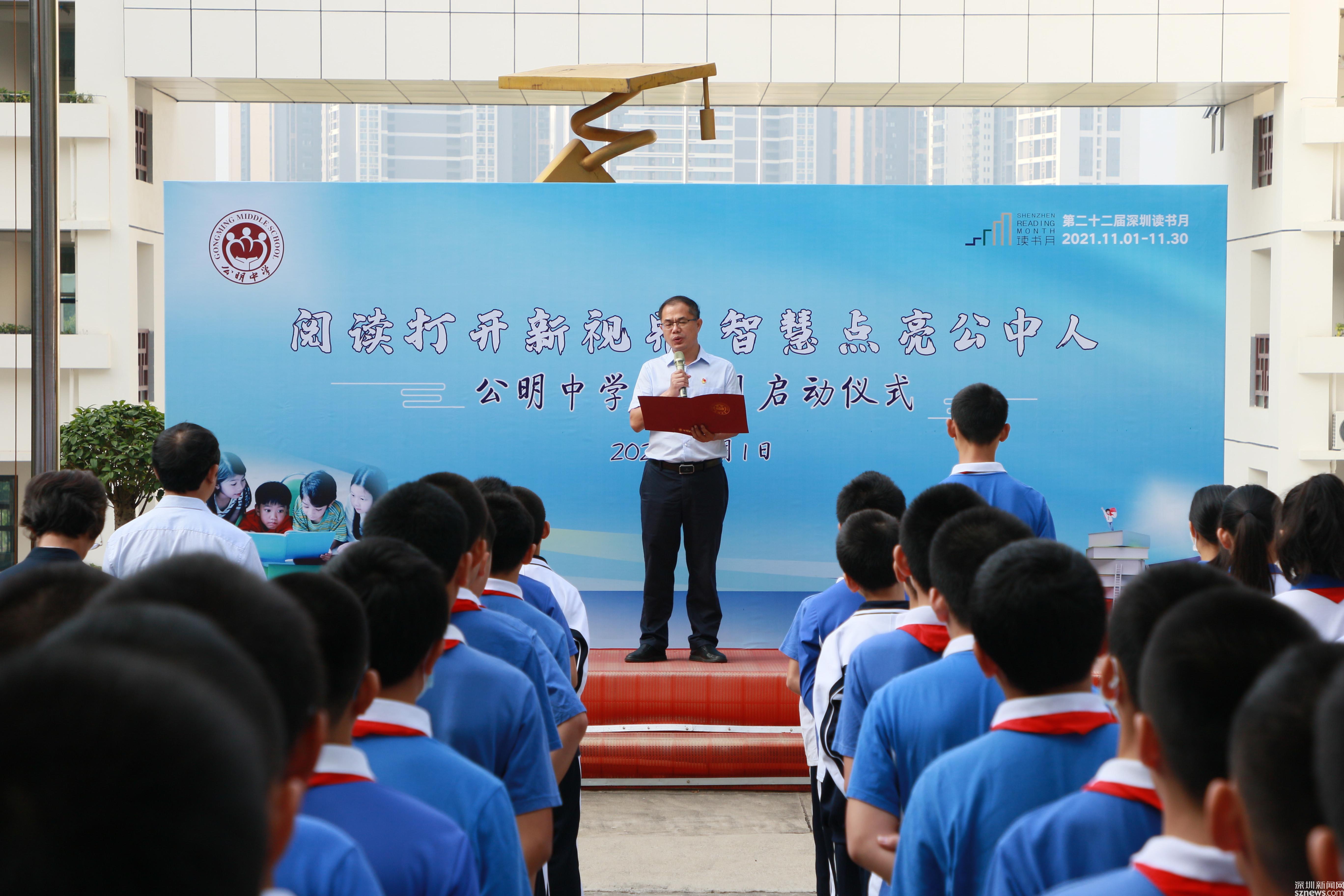 读特客户端·深圳新闻网2021年11月2日讯 (记者 曹园芳 通讯员 丘翘楚 刘小云 曾静敏)为弘扬“尊重知识崇尚文明”的阅读理念,培养师生良好的阅读习惯,营造智雅的学习氛围,塑造浓郁书香学习型校园,11月1日上午,深圳市光明区公明中学组织开展了本年度读书月启动仪式,全校师生参加了活动,活动由初二(5)班谭欣怡同学主持。