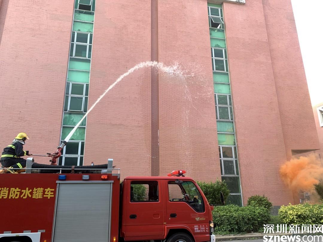 演练情景设定为工业园巡查人员发现火情,立刻上报并报警。随后火警警报骤响,楼道内冒出浓烟,疏散演练正式开始。工业园职工、居民在各组工作人员的指挥下,用口罩、衣服等捂口鼻,屈膝弯腰沿着既定的疏散路线,迅速向安全区域撤离。随后社区消防员到达现场,用消防高压水枪进行高空灭火,扑灭火灾,解除警报。演练结束后,社区还组织工业园职工、居民参加安全体验活动,学习消防救援设备的用法、进行消防结绳和灭火实操训练。