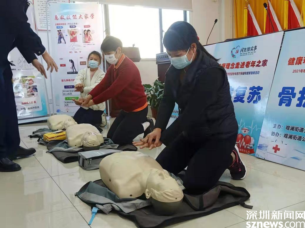 据了解,观澜街道有多家老年人之家、长者服务中心,为积极应对人口老龄化,满足辖区老年人对居家急救、居家健康知识的迫切需求,街道积极开展老年医疗保健和居家急救活动,如心肺复苏急救体验学习、骨折包扎体验学习、防异物梗塞体验学习等,使老年人充分了解到生活中一些突发事件的应对方法,在保护自己的同时也能够帮助到他人,为实现居民应对“突发疾病”的自救奠定良好基础。