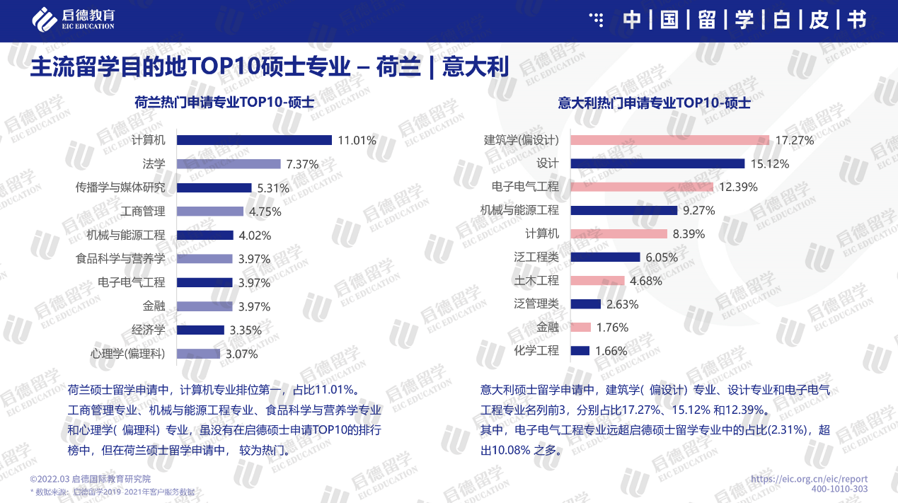 除此之外,各留学目的地的热门专业各具特色,比如美国的“金融工程、金融数学”专业、加拿大的“工商管理”专业、日本的“文化研究类”专业、中国香港的“社会政策与行政管理”专业、新加坡的“商业分析”专业、荷兰的“食品科学与营养学”专业、意大利的“建筑学”专业。