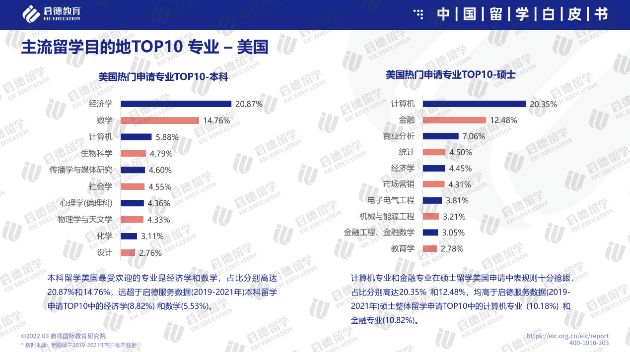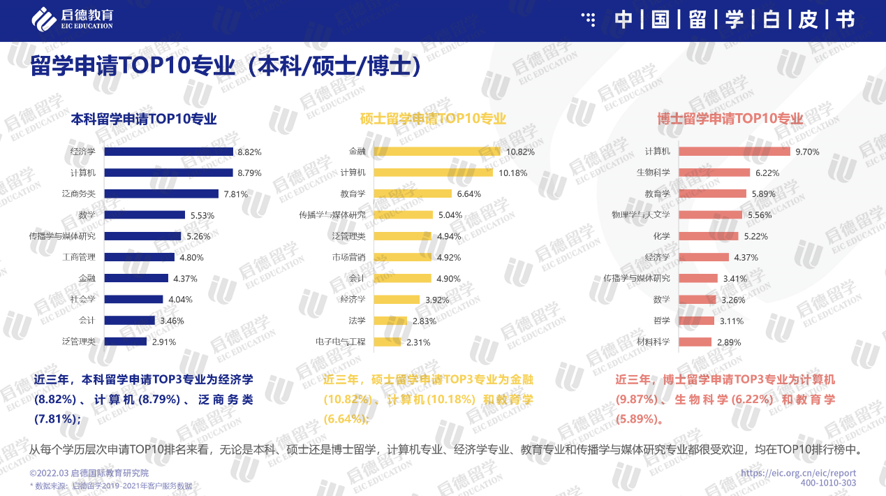 本科留学申请十大专业分别为:“经济学”(8.82%)、“计算机”(8.79%)、“泛商务类”(7.81%)、“数学”(5.53%)、“传播学与媒体研究”(5.26%)、“工商管理”(4.80%)、“金融”(4.37%)、“社会学”(4.04%)、“会计”(3.46%)、“泛管理类”(2.91%)。硕士留学申请十大专业分别为:“金融”(10.82%)、“计算机”(10.18%)、“教育学”(6.64%)、“传播学与媒体研究”(5.04%)、“泛管理类”(4.94%)、“市场营销”(4.92%)、“会计”(4.90%)、“经济学”(3.92%)、“法学”(2.83%)、“电子电气工程”(2.31%)。博士留学申请十大专业分别为:“计算机”(9.70%)、“生物科学”(6.22%)、“教育学”(5.89%)、“物理学与天文学”(5.56%)、“化学”(5.22%)、“经济学”(4.37%)、“传播学与媒体研究”(3.41%)、“数学”(3.26%)、“哲学”(3.11%)、“材料科学”(2.89%)。