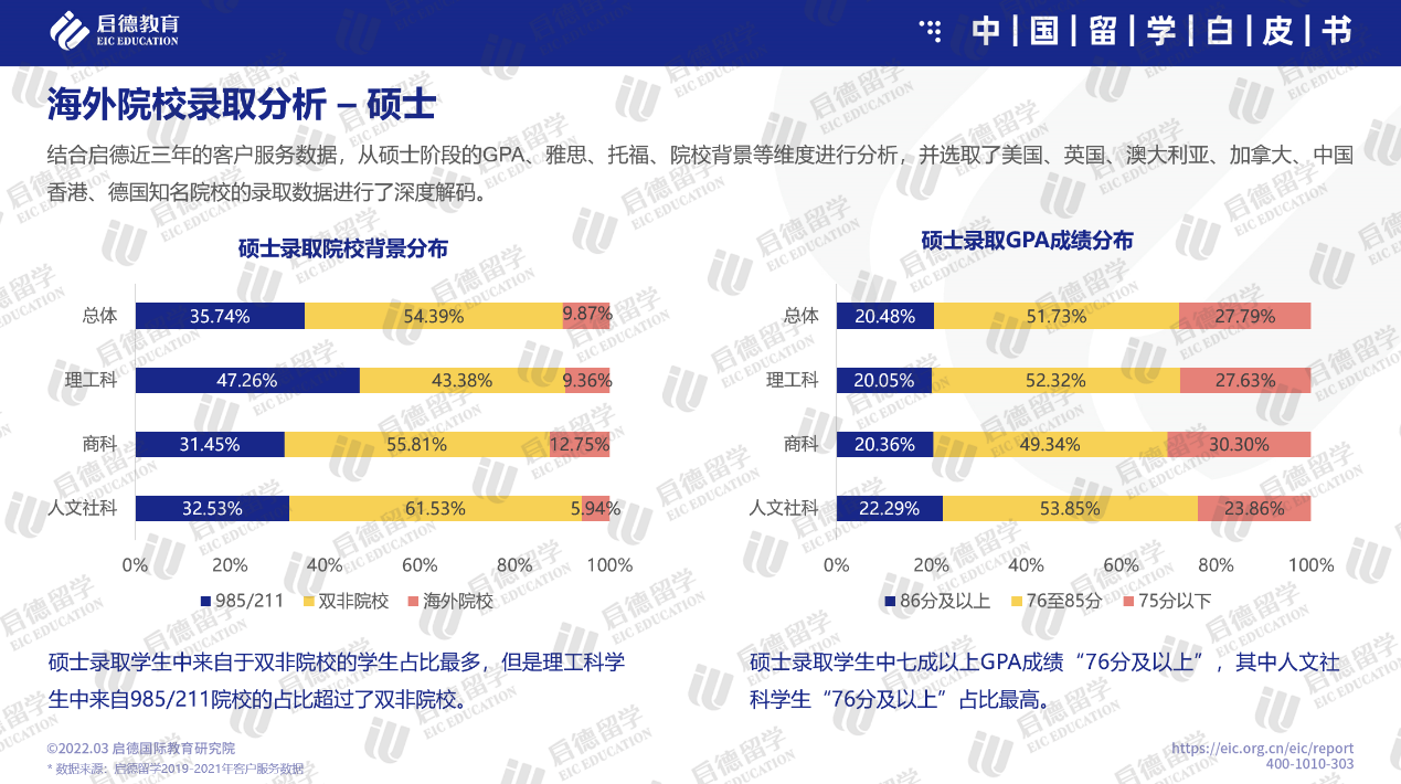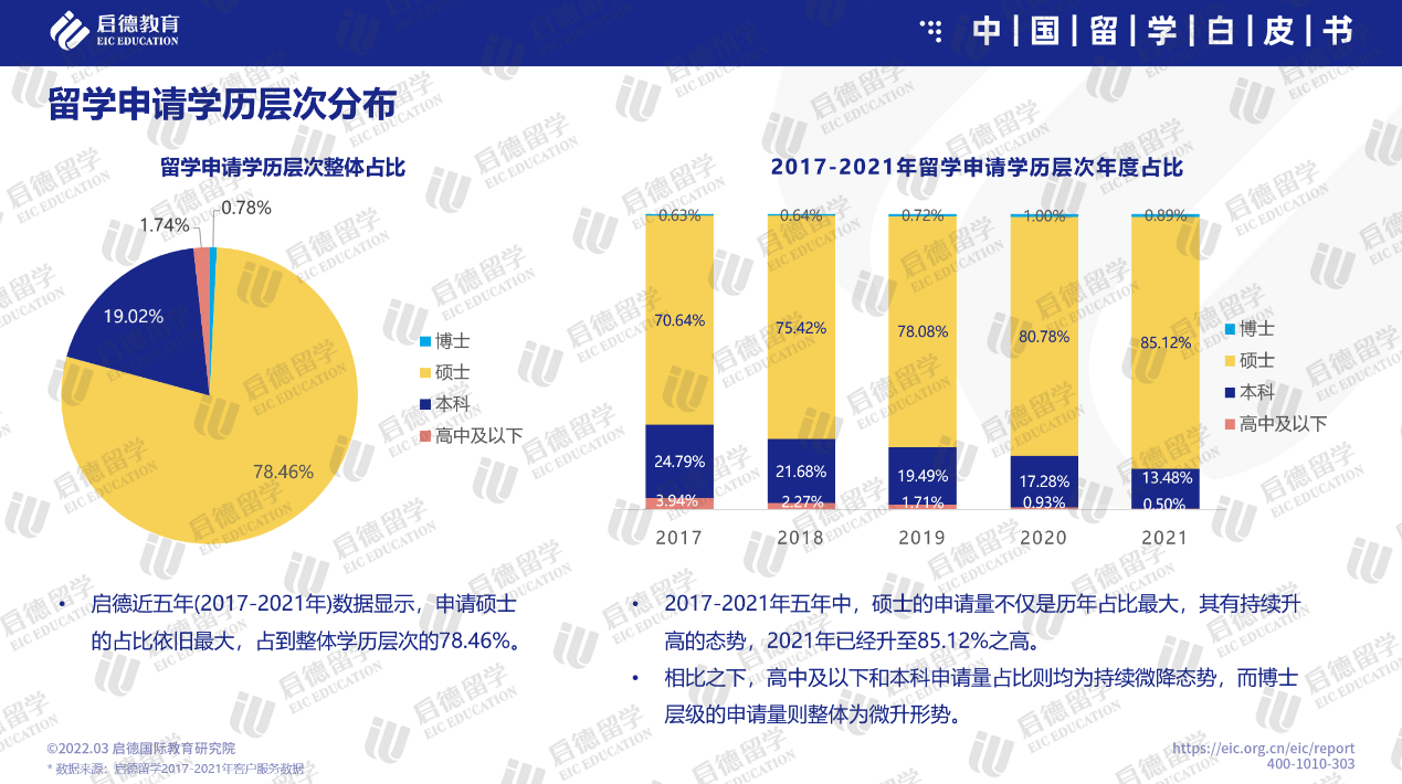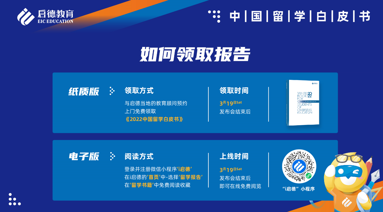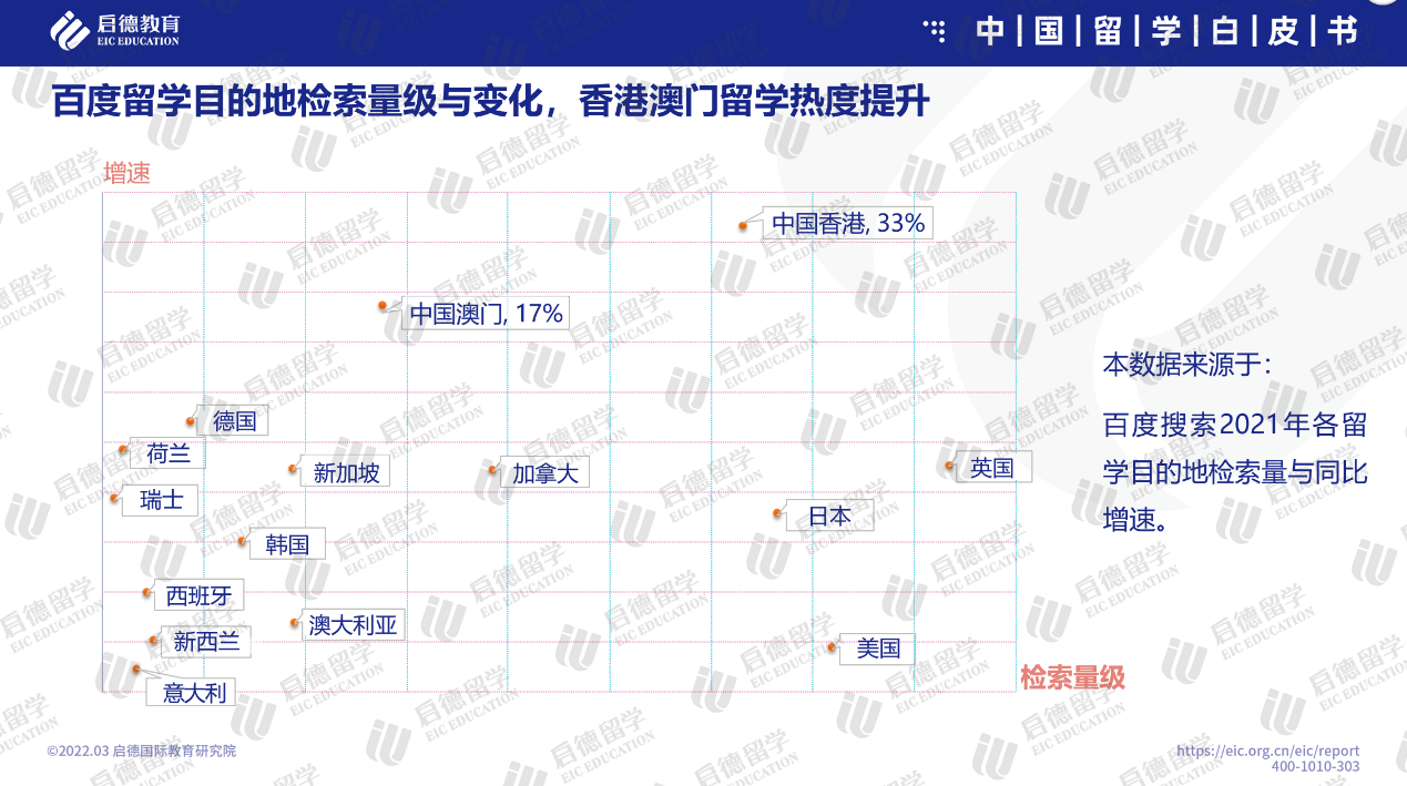 读特客户端·深圳新闻网2022年3月20日讯(记者 陈彬 曹园芳)2022年3月19日,启德教育在北京发布《2022中国留学白皮书》,以近5年的启德留学客户大数据为基础,从本科、硕士、博士三大留学阶段、重点学科百余专业的留学申请、六大标化成绩海外名校录取背景的差异分析入手,配合市场调研与留学生访谈,结合12个留学目的地的官方数据,梳理出系统化的留学申请攻略与海内外就业移民指南。通过整合分析留学意向、院校申请、名校录取、985院校留学、就业行为的多维度数据,绘制中国学生留学状况的全景图谱。