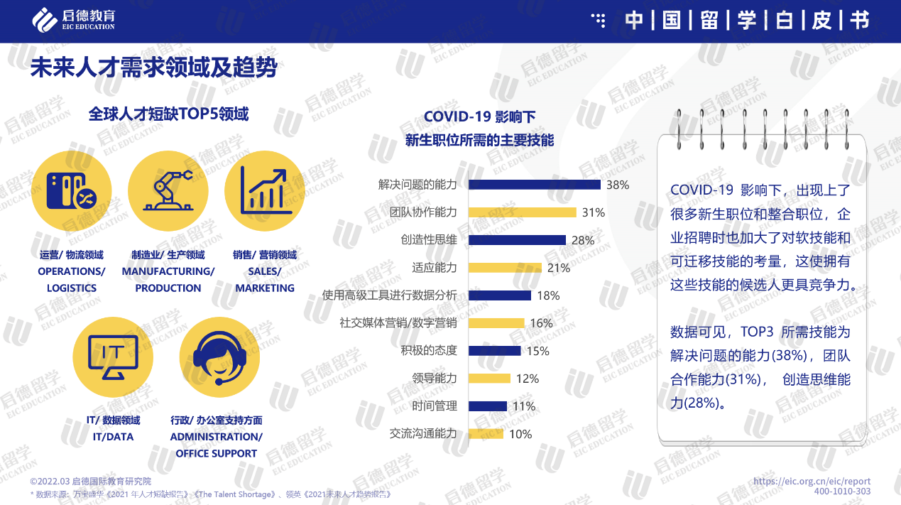 海归就业方面,据领英《2021未来人才趋势报告》显示,在新冠疫情影响下出现了很多新生职位和整合职位,这些所需技能的前三位分别为解决问题的能力(38%),团队合作能力(31%),创造思维能力(28%)。启德调研数据显示,16%的留学生留计划“留在当地继续工作生活”,46.2%选择“回国发展”。英国毕业生工作签证 (Graduate Route)开放申请后,所有国籍的英国留学生都将享受到2年的工作签证。《2022英国毕业生就业报告》显示,2022年的毕业生起薪中位数是八年来最高,为32000英镑,其中投行、律师与咨询行业起薪最高。