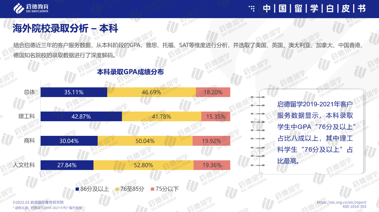 海外院校录取的学生标化成绩主要分布在哪个区间?不同的学科与不同的名校的录取成绩有什么区别?启德留学2019-2021年客户服务数据显示,本科录取学生中,GPA“76分及以上”占比达到八成以上,理工科学生“76分及以上”占比最高,达到84.65%。近七成学生雅思成绩在“6分及以上”,理工科学生“6分及以上”占比最高,达到77.50%。近五成学生托福成绩在“94分及以上”,人文社科学生“94分及以上”占比最高,达到59.23%。近五成学生SAT成绩在“1350分及以上”,人文社科学生“1350分及以上”占比最高,达到60.80%。