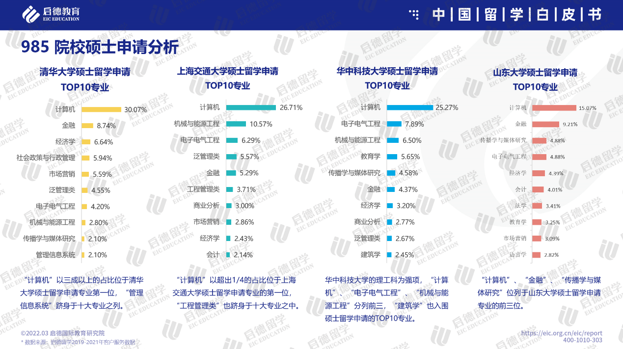 《启德教育2022中国留学白皮书》还对985院校中的十余所院校的留学数据进行了切片式分析。启德留学2019-2021年客户服务数据显示,清华大学、上海交通大学、华中科技大学、四川大学硕士留学均以理工科见长,“计算机”、“电子电气工程”、“机械与能源工程”在这四所高校硕士留学申请专业的占比均超出了1/4。