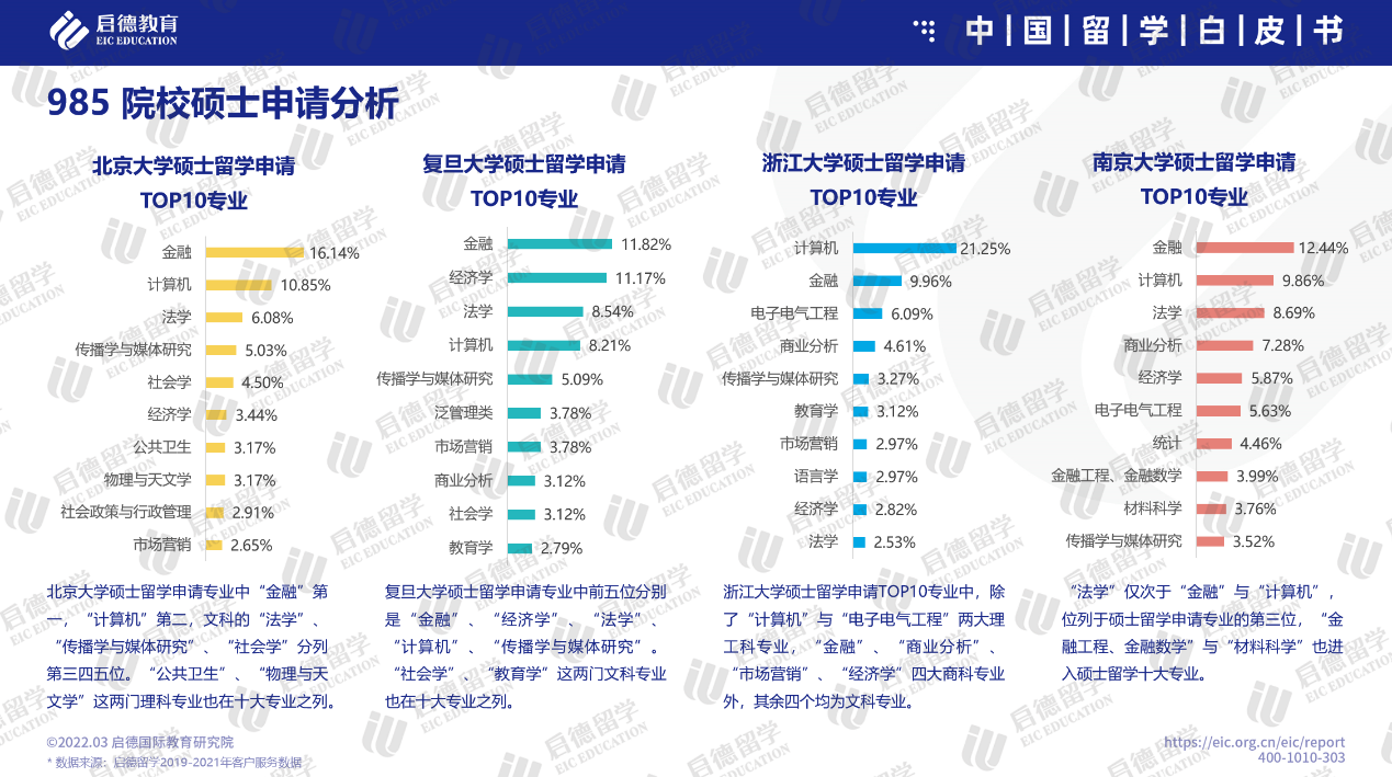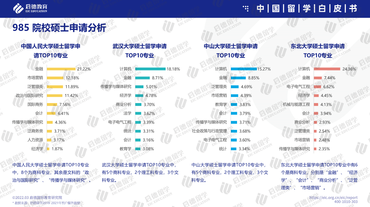 北京大学、复旦大学、浙江大学、南京大学、山东大学的商科、理工科与文科齐头并进,除了“金融”与“计算机”两大商科与理工科的王牌专业外,“传播学与媒体研究”作为人文社科中的代表也成为十大硕士申请专业之一。中国人民大学、武汉大学、中山大学、东北大学的商科硕士留学更具优势,中国人民大学的8个商科专业,武汉大学与中山大学的5个商科专业,东北大学的6个商科专业跻身于留学申请十大专业。