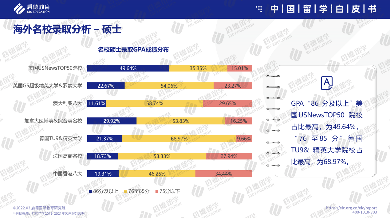 启德留学2019-2021年客户服务数据显示,提交申请的学生被美国U.S. NewsTOP50院校、英国G5与罗素大学、加拿大医博类名校和综合类名校、澳大利亚八大的录取占比均超过了六成。名校本科录取学生中,美国U.S. NewsTOP50院校、英国G5与罗素大学、加拿大医博类名校和综合类名校、澳大利亚八大的八成学生GPA成绩在“76分及以上”。英国G5与罗素大学、加拿大医博类名校和综合类名校、澳大利亚八大超过75%的学生雅思成绩在“6分及以上”。美国U.S. NewsTOP50院校托福成绩“94分及以上”、SAT成绩“1350分及以上”的学生占比超过65%。