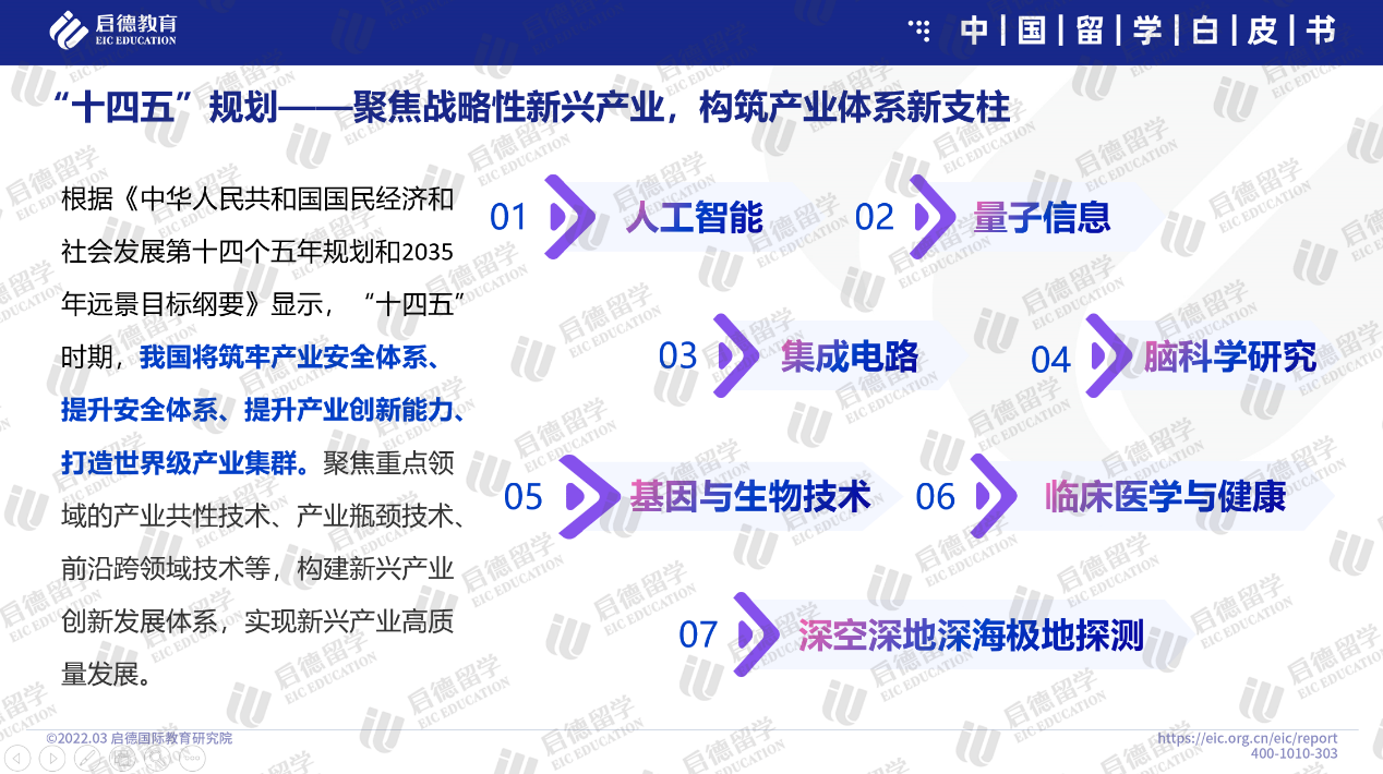 在产业升级大背景下,高端制造逐渐成为国内制造业战略发展的主题,同时在全球碳中和趋势下,新能源迎来历史性的发展机遇。在资本市场,“专精特新”作为创新能力强的排头兵企业,优先于北交所挂牌上市。在区域经济,粤港澳大湾区致力于打造以“金融+科创”为特征的全球金融中心和国际科创高地;海南自贸港以“零关税、低税率”为主基调发展旅游业、现代服务业和高新技术产业。国家战略发展与政策扶持的重点行业人才需求使得海归人才仍将大有用武之地。