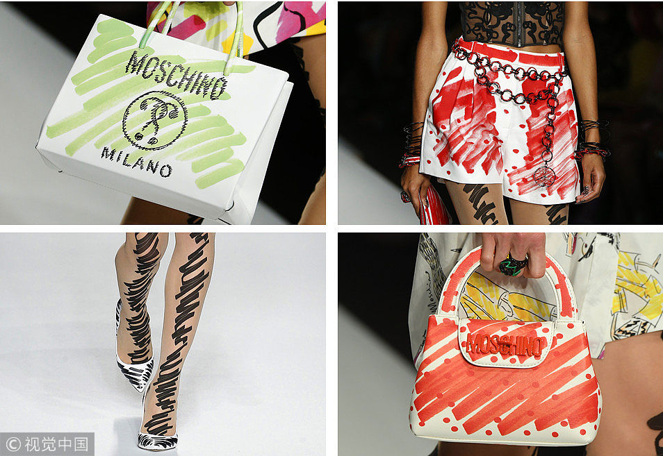 Moschino 2019春夏系列发布会于当地时间20日在米兰举行,满场的涂鸦元素好玩的不得了,信手涂鸦在服饰和配饰上,瞬间放下束缚回归本真,带你追忆无忧无虑的孩童时代~ (图片来源:视觉中国)