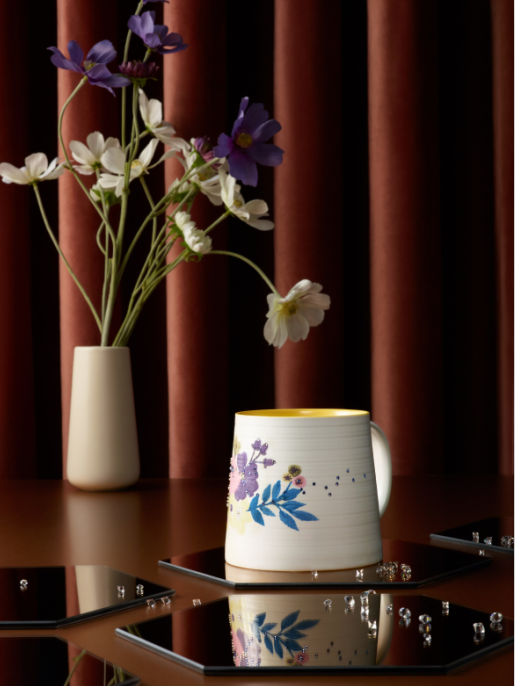 一千多年前,吴越王在寄予夫人的信中写到,“陌上花开,可缓缓归矣”,意为田间阡陌,花已遍地,你毋需着急,一边赏花一边回来,尽兴最好,我可以慢慢等你回来。寥寥数字,却写尽了一个丈夫对妻子最深沉内敛的爱。如今,设计师将这份感动重新演绎,请绣娘手工刺绣花样图案,并将带有真实纹理质感的“陌上花开”图案,运用到日常家居用品上。同时,在花朵、花瓣及叶片位置,点缀81颗施华洛世奇元素,仿佛晶莹露珠,在阳光照拂下,诉说着心无旁骛、用心守候的深深爱意。