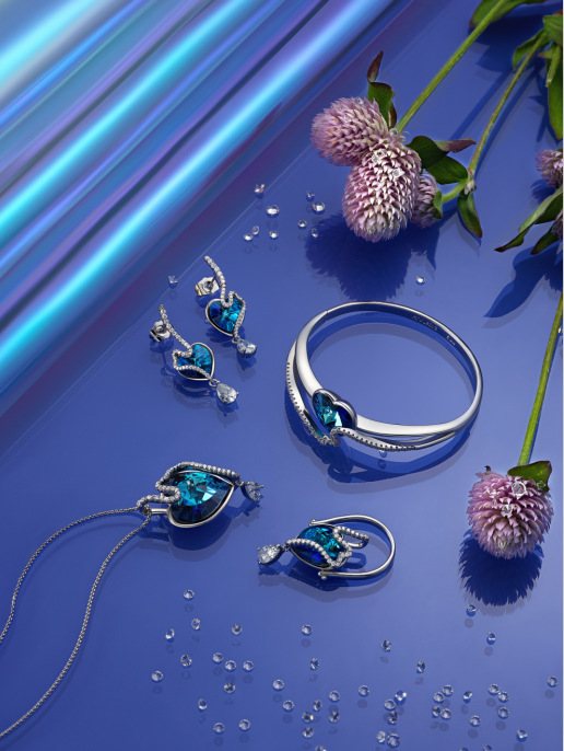 金色阳光下,在迷人而慵懒的南法海岸,与爱人漫步细腻的沙滩,任由宽广而平静的海浪轻拍脚丫。海风送来浪漫的情话,害人羞涩,而海浪优美柔和的线条里则藏着纯洁无暇的美好祝福,慢慢向你靠近。取名“纯洁的爱”,设计师试图将脑海中浮现的浪漫图景,送给每一位渴望爱情的女性。首饰中间采用了蓝色心形施华洛世奇元素,在宛如波浪的金属线条下,蓝色水晶为作品增添了一份宁静。
