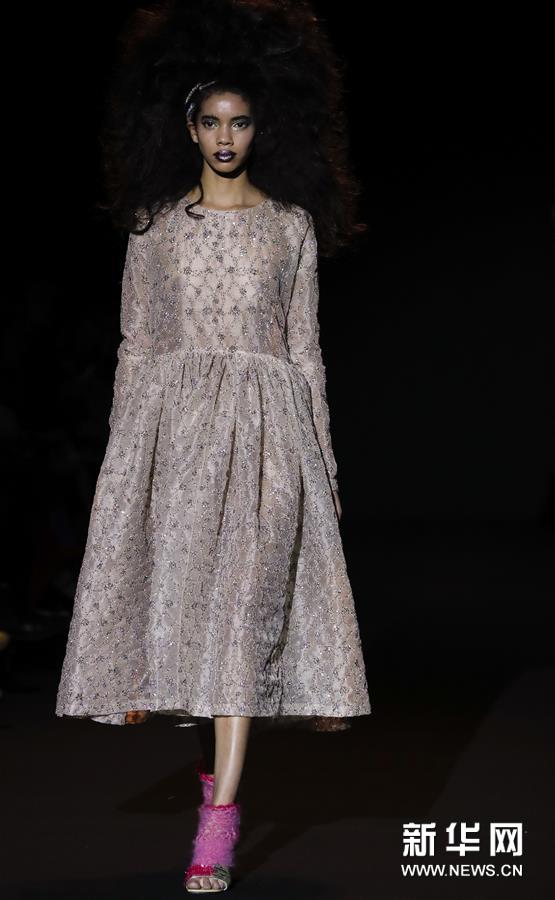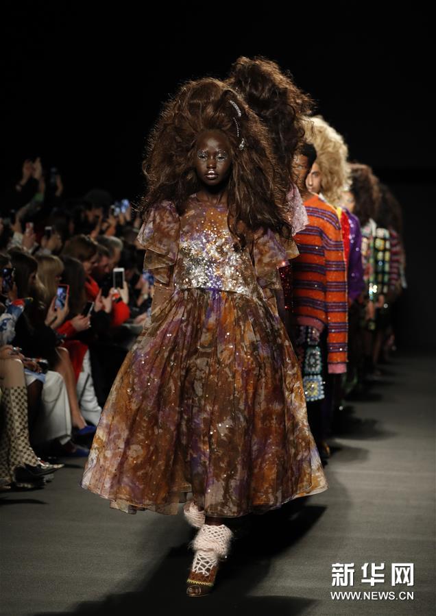 新华网2019年2月18日讯 2月17日,在英国伦敦,模特在2019伦敦秋冬时装周上展示Ashish品牌服饰。新华社记者韩岩摄