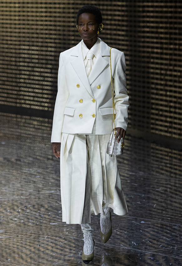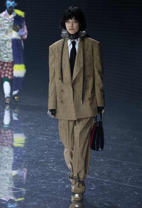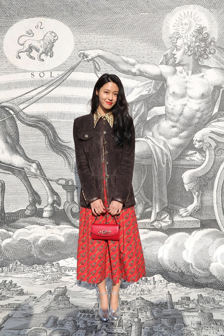 金雪炫穿着Gucci 2019春夏系列Look 61棕色绒面革夹克,马衔扣印花真丝衬衫及半裙,搭配银色皮革浅口鞋,手拿Gucci Zumi系列小号红色皮革手提包。