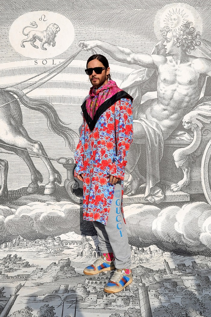 Jared Leto穿着Gucci 2019春夏系列Look 60花卉印花长款真丝衬衫,灰色慢跑裤,搭配Screener系列蓝白皮革运动鞋,粉色花卉印花连帽围巾及黑色方形框架太阳眼镜。