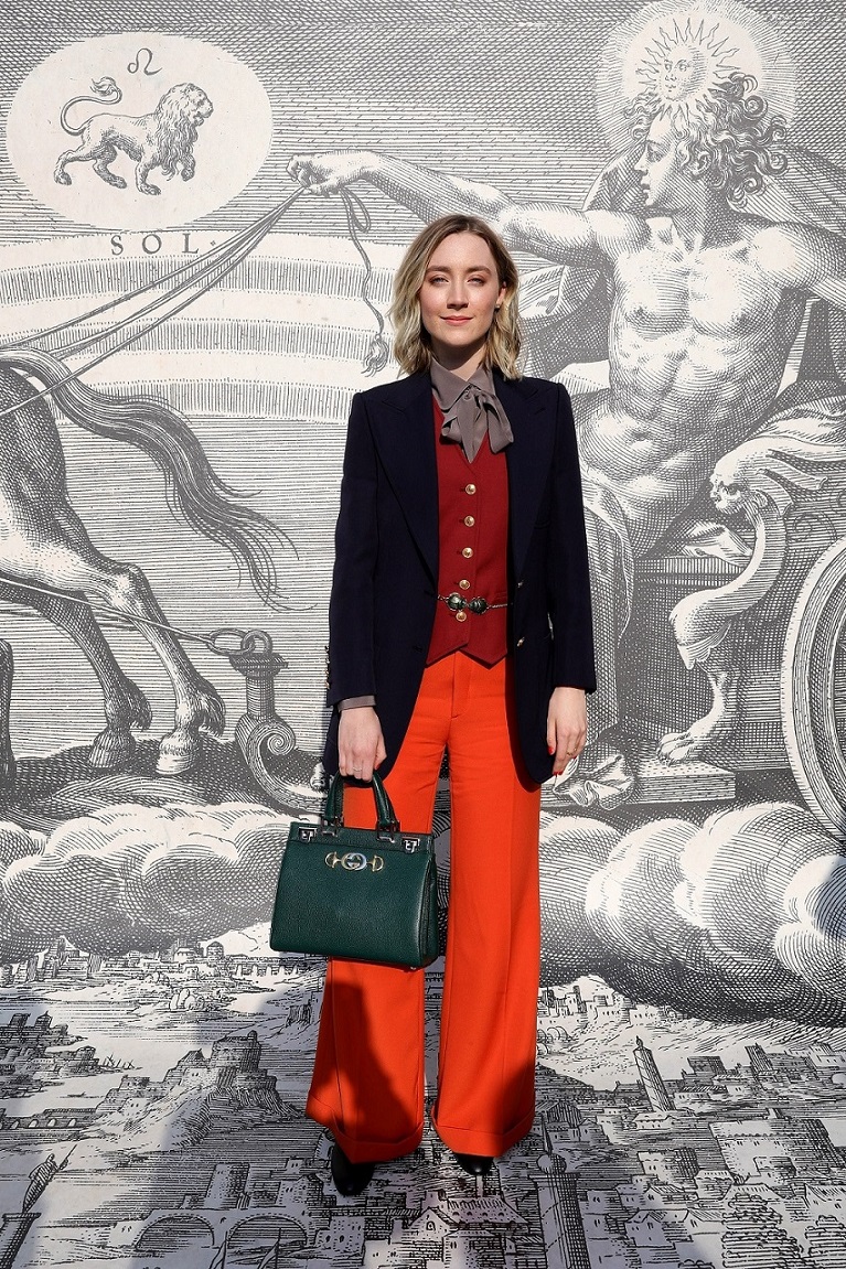 Saoirse Ronan穿着Gucci 2019早秋系列Look 17深蓝色外套,饰金色纽扣铁锈色背心,灰色真丝衬衫,橙色阔腿裤,搭配黑色皮革浅口鞋及GG Running系列耳环及戒指,手拿Gucci Zumi系列绿色皮革手提包。