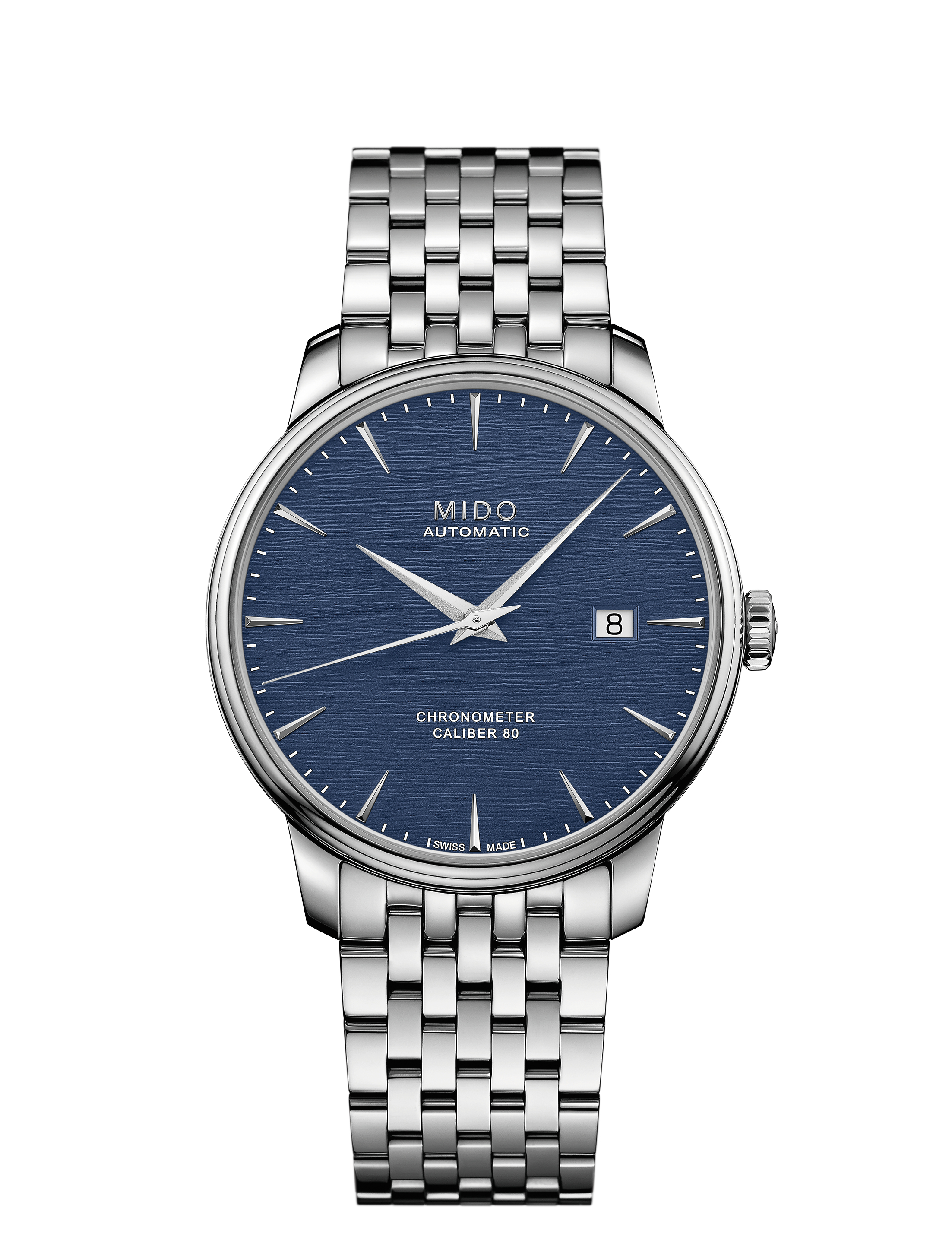 在蓝宝石玻璃的保护下,通过透明背底可清晰观测其精雕细刻的机芯,采用蓝色螺钉,自动摆陀装饰有日内瓦波纹和 MIDO标志。防水深度30米,并配有棕色小牛皮轧鳄鱼纹表带和不锈钢折叠表扣。