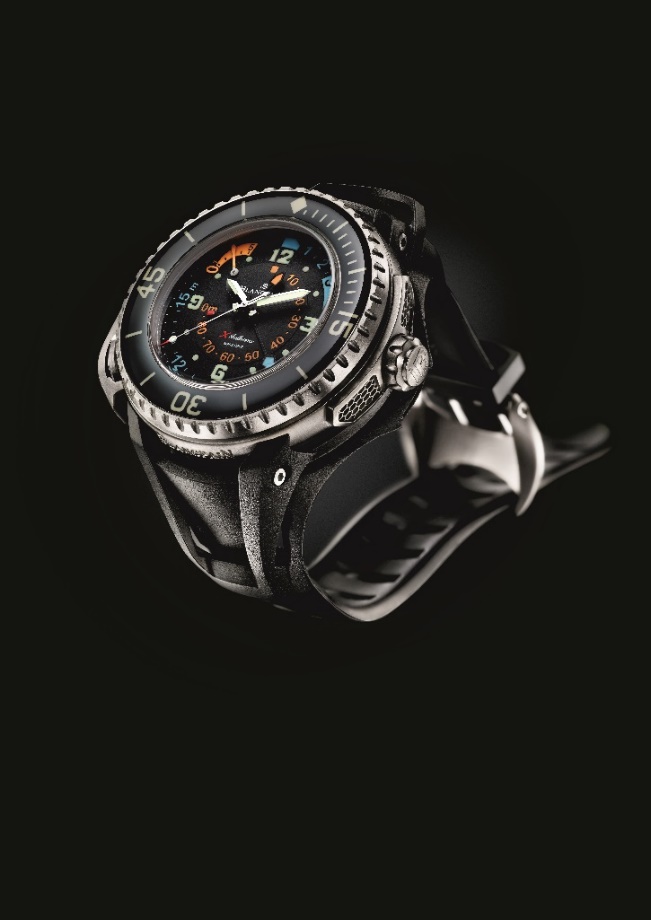 作为五十噚系列的巅峰之作,宝珀 X噚复杂机械潜水表,强势演绎了品牌的创作激情和非凡能力。 X噚到底为何物?如果字母“X”代表一种变量,那么 X噚腕表则完美综合了三层内涵——既能测量不断变化的深度,又可以彰显极限运动的理念,更拓展了有史以来各种机械潜水腕表的概念范畴。作为专业机械潜水腕表, X噚不仅具备界定潜水腕表的所有特性——防水、稳健、抗磁性、水下易读性、单向旋转表圈、荧光显示、旋入式表冠,还加载有两个深度指示器 (测量深度可达90米,同时又能突出显示至关重要的0-15米刻度段,并确保系统的精确性)、一个极限深度指针 (专门用于显示潜水的最大深度 )以及一个5分钟倒计时器 (精准计算上浮过程中做减压停留的时长 )。仅凭借这些“王牌”特性, X噚就足以在机械潜水表的世界里堪称“第一”。